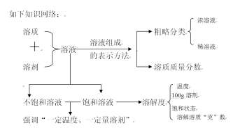 复习好双基,把以前学过的知识进行梳理、提炼,找出各部分知识块之间的内在联系,形成网络。将知识系统化、条理化,由点到面、由面到体,形成一个有机联系的立体空间。如复习《溶液》时,可编写如下知识网络: