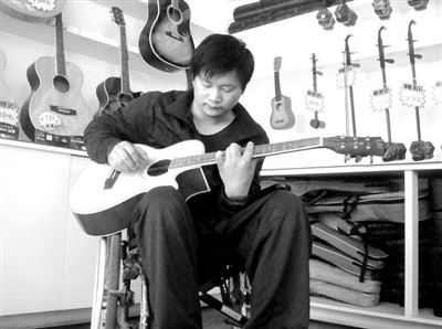 自从双腿残疾后,他做梦都不敢想自己能拥有音乐事业。有一次,他和朋友聊天时,朋友问他想做什么时,他一下子愣住了。朋友善意地提醒说:“你的吉他弹得这么好,为什么不能作为事业来发展。”朋友的一席话让他茅塞顿开。周咸兵说,和家人商量后,他决定和朋友一起投资开一家琴行,招学生教各类声乐知识,而自己可以传授吉他。
