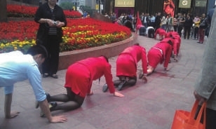 5月2日,当着数百围观者的面,一群人身着制服跪在繁华商业地段,一边爬圈圈一边喊加油。经调查,此为一化妆品公司对员工的挑战压力课程。该公司对员工的管理行为引发不少网友的反对。 (网易财经)