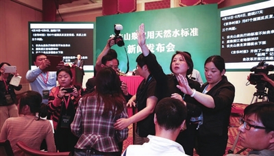 5月6日,在农夫山泉召开的新闻发布会上波澜再起,遭遇了京华时报记者“砸场子”。当天下午,农夫山泉在北京召开新闻发布会,称农夫山泉已向北京市中级人民法院提起诉讼,要求《京华时报》赔偿名誉权损失6000万元。当农夫山泉董事长钟睒睒指责京华时报在没有采访农夫山泉的情况下,做了不客观的报道时,京华时报一位男记者站起来,回应说是农夫山泉不愿接受采访,并不是他们没有采访农夫山泉。