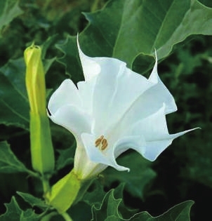 曼陀罗是有毒草本,夏秋开花,花冠漏斗状。又名风茄花、洋金花、山茄花。曼陀罗花全株有毒,以果实以及种子毒性最大,干叶的毒性则比鲜叶小,其叶、花、籽果、茎均可入药。必须注意的是,曼陀罗不是曼佗罗,“陀”和“佗”一字之差,确是云泥之别:前者是毒品,后者是茶花。 (据《刘继兴读史》)