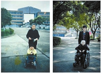 第二张照片拍摄于今年五一,背景仍然是宁波大学的南天门,但陈效松已是一名大学生了。陈效松说,前一段时间,他在翻看相册时,看到自己和奶奶21年前在宁波大学大门前的合影,想到89岁的奶奶身体大不如前,连吃饭走路都需要专人帮助,他不由得心里一酸。为了不留下遗憾,陈效松决定带奶奶重走祖孙俩以前一起去过的地方,宁波大学是第一站。当年奶奶推着还是婴儿的陈效松,一遍一遍地叮嘱他要成为有用的人。现在,孙子推着奶奶,大声地向听力不好的奶奶描述着自己在学校生活、学习的点点滴滴。“那一天,她居然还记得这个地方,我特别高兴。”他说。