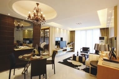 吉诚装饰的精品设计师王旭介绍,客厅、餐厅、卧室以及书房都只运用黑白灰咖这四种颜色。因为客厅与餐厅是相连的,所以就运用颜色及吊顶来做区域的划分。客厅的墙面整体使用的是白色系,为了拉伸空间,在电视背景墙和沙发背景墙上都分别安置了黑色镜面,黑白结合,搭配得当,时尚美观。