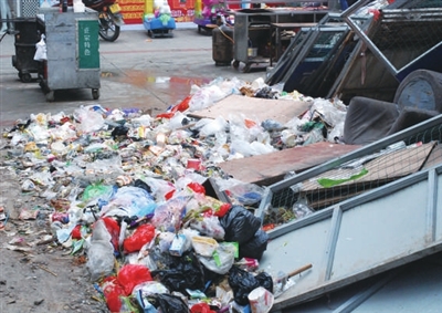 小吃摊和垃圾堆当起了“邻居”,一眼望去,让人大倒胃口。不得不问,本不该出现在这里的垃圾堆,何以露天堆放,进而成“山”?