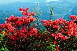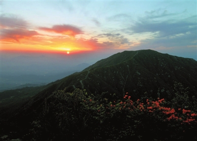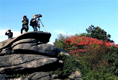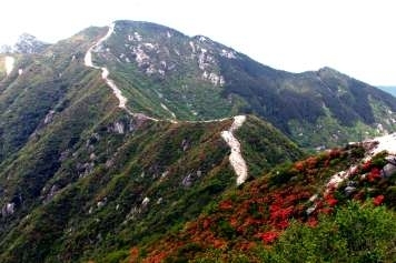 一路上,古木参天,郁郁葱葱;流泉飞瀑,曲径通幽;泉水叮咚,松涛阵阵,这就是一幅山清水秀的诗意画卷。清新宜人的空气,顿时让人感受到天然氧吧的清透与快意。登上山顶,漫山遍野的杜娟花,远看火红一片,像铺上了一层红地毯;近看如血染一股,浓艳而不腻。再看山上的奇石异景,犀牛望月、神龟驮经、一线天、玉女抛梭,形象逼真,栩栩如生,让人不禁感叹这大自然的鬼斧神工。站在只角楼上,向北面俯眺,只见盘山公路迂回曲折,宛如一条条不见首尾的游龙穿越在崇山峻岭之间,让你的无限想象力游走于天际……