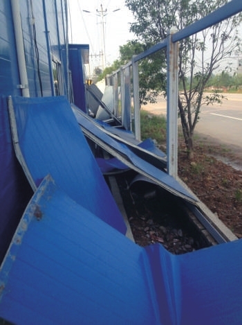 事发地点为我市在建的人防紧急救援指挥中心。该项目部现场负责人杨先生介绍,根据现场监控录相显示:当晚凌晨1时许,一群不明身份的人来工地,把供电设施砸坏后,又蹿至路边,将约60米长的挡板全部推倒毁坏(如右图)。