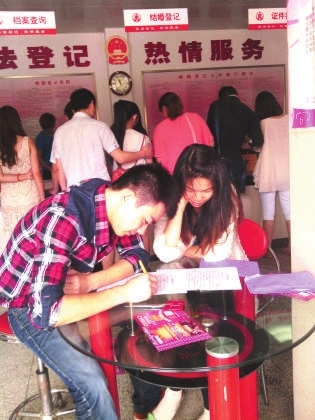 咸安区民政局婚姻登记处工作人员介绍,现在年轻人结婚选择5月20日、10月10日、11月11日、12月12日等特殊日期的越来越多。像2008年8月8日、2009年9月9日、2010年10月10日,2012年12月12日,2013年1月14日,婚姻登记处都人气爆增。