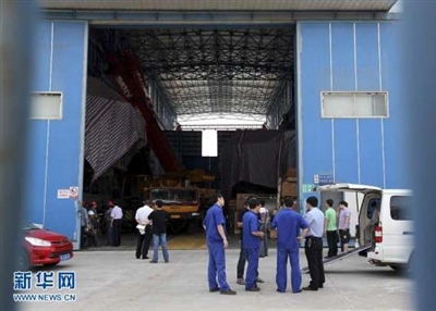 昨日11时许,湖北省宜昌市伍家岗区一工厂在施工过程中机器发生故障,二百吨的机械坠下,多名工人被压,目前已确定有2名工人身亡。据初步了解,事故工厂为宜昌船舶柴油机有限公司。事发时,工人们正在施工安装的两百多吨机械钢丝绳突然断裂。图为宜昌船舶柴油机有限公司事故车间,一辆吊车停在车间用于施救。 (据新华网)