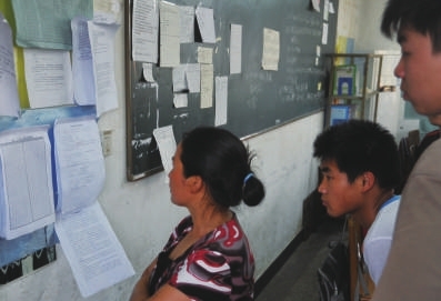 趁孩子吃饭的间隙,一位家长在教室内看到孩子最近模拟考试的成绩时,呢喃道:还得努力。