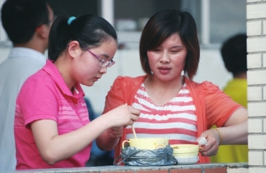 “慢点吃,喝点水!”教学楼四楼走廊的栏杆旁,许多学生家长陆续赶来为孩子送饭,一位名叫张冰的母亲在女儿孙紫琼耳畔轻声细语道。