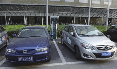 近日,可供市民租赁使用的充电式电动汽车整齐停放在北京市清华科技园区内,停车位旁配备有充电桩。20日,根据北京市科委牵头实施的“电动北京伙伴计划”,15辆新电动汽车在此投入试运营,其中5辆为试驾车,其余供租赁,租赁费用为49元/两小时或99元/天。