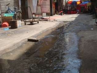 5月23日,记者赶到现场,远远就看见一条污水带,热风里夹杂着一股恶臭扑面而来。走近一看,发现污水是从一栋居民楼楼下缝隙汩汩流出,沿着道路延伸,外溢污水犹如一条小溪,并在地上留下印迹。“这儿下水道堵塞已经半个月了,每天不断地往外冒污水。现在天气炎热,这股臭味熏得人实在受不了。”附近一居民介绍说,附近的商家将污水垃圾乱倒,又没有及时疏通下水道导致堵塞,过往的市民都捂住鼻子绕道而行。