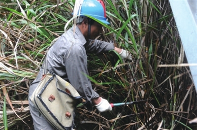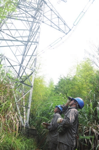 20分钟后,老施来到位于山顶的电力基桩塔下,劈开附近野草杂树,用工具包里的扳手拧紧螺丝,用小相机拍下现场情况,用望远镜远眺线路情况……整套流程下来,老施的工作服已经被汗水湿透大半。