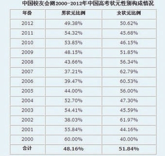调查显示,2000年以来,全国高考状元“阴盛阳衰”,女状元总比例为51.84%,男性高考竞争力下降,男孩危机日益凸显;湖北男状元比例最高,福建女状元比例最高。