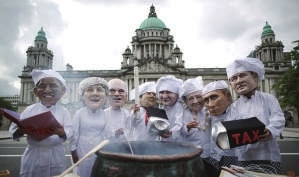 近日,英国贝尔法斯特,IF组织的数名成员头戴G8峰会各国领导人的面具围绕在“大锅”前,旨在要求G8峰会领导人关注世界饥饿和贫穷。