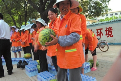 入夏以来,我市气温一路攀升。当日,为帮助环卫工人防暑,市环卫局向城区环卫工人集中发放了3万斤西瓜、2千箱矿泉水以及2千套夏季环卫制服等约合21万元的物资。