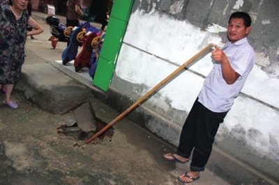 当天,记者在现场看到,由于前段时间连日降雨,西街175号居民楼旁的地表突然陷下一个直径约半米的小洞。一居民拿来一根长约2米的竹竿插入小洞中,竹竿完全被淹没。住在附近的余先生说,6月25日早上,他们出门上班,就发现房屋旁边出现了一个小洞。估计跟连日来的降雨,导致地下土被冲走有关。