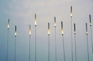 这组奇特的灯具由3毫米的碳纤维管制成,能随风闪动金色的光芒,并且加入了环境感应器,当人体传感器检测到有人时,微控制器驱动底座上的电机使稻穗干有节奏的摆动。