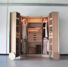 拥有一个专用于储存衣物和更衣的步入式衣帽间是所有女孩的共同追求,但理想的衣帽间面积至少也在4平米以上,因此对大多数人来说这会是个奢侈的梦想。这一款步入式衣柜则提供了一个折衷的解决方案。除了可同时用于收纳衣物、鞋帽、首饰等高效的实用性以外 ,打开后还是一个优雅的迷你试衣间。