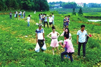 7月6日,赤壁百余名网友相约到茶庵镇白石村摘西瓜消暑的同时,体验农场生活。