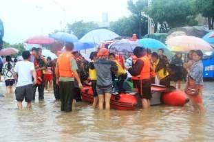 记者从云南省盈江县委宣传部获悉,受连日来强降雨影响,全县有8个乡镇和农场出现不同程度洪涝灾害,其中盏达河水暴涨,部分河段出现漫堤。据初步统计,截至9日11时,全县受灾1085户4882人,农作物受灾5383多亩,房屋受损面积7000平方米,暂无人员伤亡报告。预计未来强降雨还将持续,全县抢险救灾工作正全力进行。图为盈江县消防官兵用皮划艇疏散一所幼儿园的学生。
