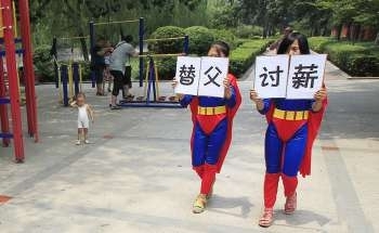 近日,郑州市人民路西侧公园里,两个女生身着“超人”服装“替父讨薪”。据“超人”说,她们是来自濮阳县梨园乡段寨村的小学生,去年3月,村上的包工头组织73个农民工到濮范高速有限公司收费站办公楼进行内外装修。5月工程验收后,剩余120多万元至今拖欠未给。