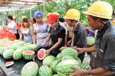 咸宁义工的负责人黄大望介绍,此次送清凉他们自筹资金,准备了600斤西瓜,今天过来送清凉的有高中毕业的学生,有退休的老干部。农民工兄弟为城市建设添砖加瓦,送去的不只是西瓜,更代表咸宁人民的情意和关爱。 (记者 方达星)