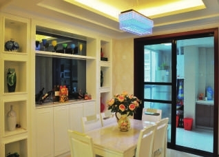 东鹏装饰设计经理周济民介绍道,房屋原本在此处有两个梁,很不美观,所以需要用吊顶来进行修饰。如果按照梁的高度将其吊平,就会造成此处空间太矮,给人压抑感。于是,他就在此处用石膏线加做了几个假梁,并把天花加以造型。巧妙的设计让过道变得更加有层次感,压抑感也消除了。