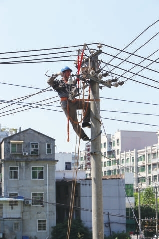 火辣辣的太阳炙烤着大地,一群电力工人正在紧张架线。汗水湿透了他们工作服,豆大的汗珠挂满了被晒得红彤彤的脸庞。