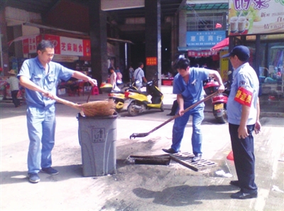 本报讯(记者吴青朋 实习生潘漩)23日上午,温泉中心集贸市场一处下水道被堵,导致路面污水横流,被创卫监督员晏纪伟发现。就在晏纪伟想办法解决时,却被其他工作人员“抢先”清理干净了。