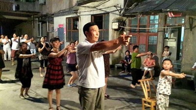 7月23日晚上7时许,记者走进了小院子,只见邻居们正一招一式跟着江贤俊练习保健操,其中不乏耄耋老者,最年轻的学员也有42岁了。“干洗脸……十指挠头,预防偏头疼。”江贤俊边做边缓缓说出动作要点和功效。