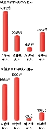 其中,城镇居民工资性收入5311元,同比增长4.87%,增速排名垫底;经营净收入2025元,同比增长15.99%;财产性收入442元,同比增长13.95%;转移性收入2322元,同比增长14.86%。