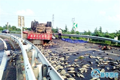 7月29日,在江苏镇江,一辆运送鲜鱼的货车因为操作不当,在连接扬溧高速公路和沪蓉高速公路的丹徒互通内翻车,三万斤活蹦乱跳的鱼儿撒满匝道路面,一时造成道路单向中断,幸亏人员没有大碍。可惜的是,由于高速路面气温太高,大部分的鱼儿捡着捡着就“烤熟”了!