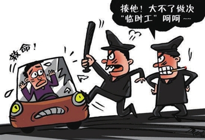 日前,河南南阳市内乡县板场乡派出所一名副所长和几名民警在开车执行公务途中,因前方一辆私家小轿车没有及时避让,便逼停对方,将其前挡风玻璃砸烂并试图开车门打人。事后声称涉事人员为“临时工”(7月31日《大河报》)