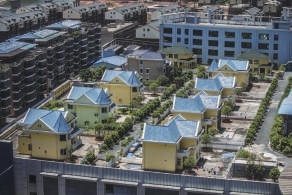 湖南省衡阳市一家居广场的楼顶上,25栋别墅整齐地排列着,带来了不小的安全隐患。这些未办理任何审批手续的“空中别墅”,规划等部门曾多次责令拆除。不过,别墅投资建设方最终表示,相关部门已默认不拆除,由其自己处理,但不能销售。(新华网)