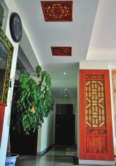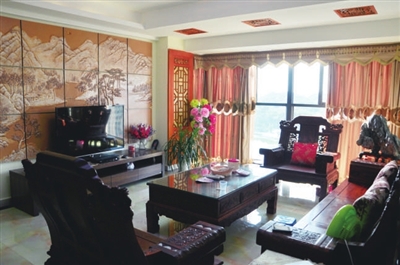 深棕色的木雕座椅代替了一般家中的皮质、布艺沙发,立体雕刻山水画电视背景墙取代了传统的墙漆和墙纸,就连照明的灯也为其配备了精致的“外衣”——镂空雕花灯罩。