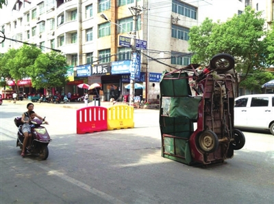 14日上午10时许,记者在该路口处看到,一辆三轮摩托四脚朝天,“昂首”立在马路中央,给此处交通带来不便。而三轮摩托身后护栏上方不足1迷高处则有多根下坠线缆(如图)。附近居民介绍,缆线坠下后一直无人处理。11日下午6时许,一辆三轮摩托经过时,车顶被电线绊住翻了车。