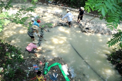 在虎岩村过境河道的一处岔口,水库来水流到此处。在浑浊的浅水中,十余名群众正在河道中筑起一道简陋的泥沙坝,其中几名妇女挥动锄头挖得热火朝天,拖水管、搬水泵,健步如飞,一点也不输男人。