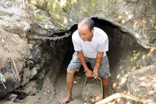 采访时,桂家村的村干部来镇上汇报旱情,赵伟岭和我们一行随即赶往桂家村。在石人冲水库附近的山腰沟渠上,63岁的村民邓有田正在和其他村民一起奋力清理一处一米高的涵洞内的淤沙。
