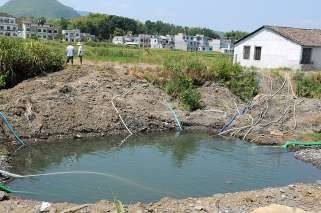 在横冲村的一处塘堰前,村支书袁明卓正和老百姓一起抽水抗旱。袁明卓说,把附近南港河的水抽到塘堰里,再从塘堰分级提水到田间地头,1700多亩中稻已有300亩绝收,剩余的稻田无论如何要力争保住,不然这一季老百姓的收成影响就太大了。