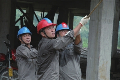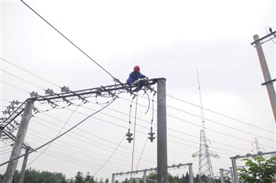 程师傅爬上电线杆后三个多小时,一直在60多度的横担(钢制)上作业。“在电线杆上或铁塔上工作三四个小时很正常。”程师傅说,他从事电力工作30年了,早已习惯了炎热的天气,夏季每天至少要喝5升水,否则很容易中暑。