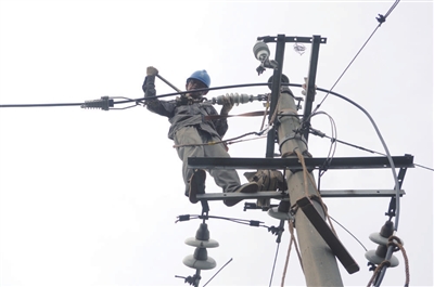 下午4时许,抢修队解决了咸安官埠线路跳闸问题,随后又赶到张公,200多米长的线路被挂倒的树木折断,配电二班成员临时牵线,奋战两个小时后全镇恢复了通电。