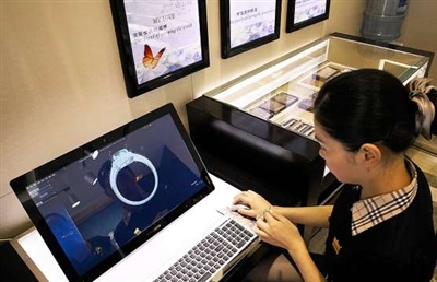 近日,成都春熙路刚开业不久的一家珠宝店吸引了不少青年男女前来尝鲜。这家珠宝店在全国范围内创先河地利用3D打印机技术由顾客DIY珠宝首饰。右图为珠宝店工作人员正在为顾客演示DIY设计。上图为顾客挑选从3D打印机“打印”出的一枚枚戒指模型。