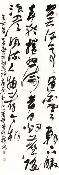 “知其白,守其黑”是《老子》中常被人称道的一句名言。计白当黑是中国艺术中最迷人最奥妙最不可言传的东西,书法也不例外。我们平时所说的书法的章法,主要是指一幅书法作品字与字、行与行、正文与落款的关系。这种关系,从视觉上看就是黑白关系。讲究章法,就是做黑白游戏。覃修毅的许多条幅书法作品,尤其是那些由几个类似斗方组成的条幅作品,其黑白关系表现得更为强烈。这些行草书作品,因为条线的洒脱飞动,使字与字、行与行的空白面积忽大忽小;又由于这些面积的大小差别比较大,书法作品的波澜起伏状态显得十分强烈。于是,在黑白对比中展现出了行草书的流动之美。“知白守黑”有着不尽的奥妙。在书法创作中如何选择空间、利用空间、分割空间,覃修毅有着自己独特的理解和技巧。 (本文作者系湖北省书画研究会副主席)
