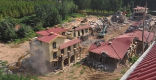 8月18日,在黄河南岸郑州市惠济区花园口镇申庄村,违规修建的别墅正在被拆除。该村违规修建并对外出售小产权别墅群被媒体曝光后,经国土部门测量认定,申庄村村支书占用15.8亩农业用地用于建设别墅。截至19日,已违规建成别墅6栋。 (新华网)