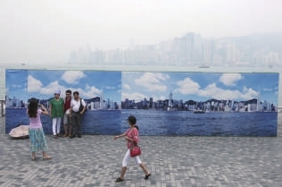 8月21日,香港雾霾严重,来自内地的游客们站在户外一个巨幅的蓝天条幅前,拍照留念。(网易)