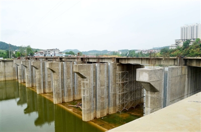 23日上午,暴雨刚过,工人们又开始抓紧施工,铺设桥面。据咸安区水利局防办副主任徐永红介绍,大畈陈拦河闸除险加固工程桥面将确保在10月1日通车。