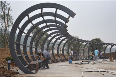 昨日,记者在咸宁温泉旅游新城南入口综合服务区旅游集散中心施工现场看到,该项目的主题工程已经完工,正在进行广场的景观及绿化建设。目前,各项建设正在逐步完善。按目前进度,9月底将完成温泉国际广场的土建和绿化、亮化工程。 赵忠志/摄