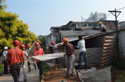 16日上午,市城管执法局联合咸安区控违办、温泉办事处,对滨河东路温泉河畔绿化带附近的一处违建屋进行拆除,还淦河沿岸靓丽景观。 (周阳秦牧阳)