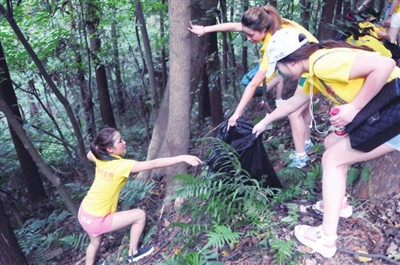 当天下午3时许,潜山国家森林公园公园入口处,百余名身穿黄色队服的闽都音乐会所成员分成七组,队员们手里拿着垃圾袋、钳子等工具,从山脚下开始徒步登山,清除公园里的卫生死角和上山通道边游客丢弃的果皮、纸屑等生活垃圾。